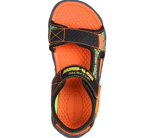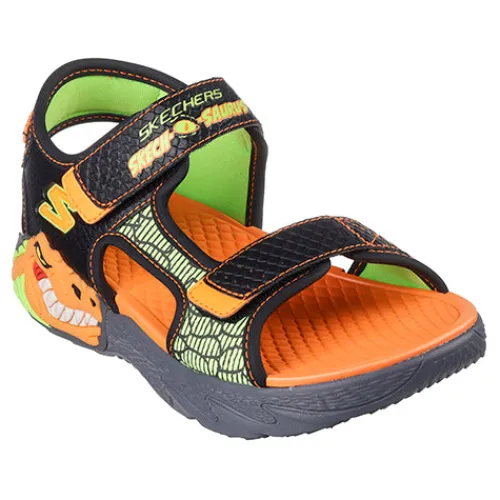 Supersej S-Lights – Creature-splash sandal med blink. Overdelen er af slidstærk syntet i bl.a. læderlook og drageskindslook, og sandalen lukkes med to velcroremme over forfod og vrist. Den orange indersål er blød og komfortabel, og den fleksible ydersål har et godt mønster og giver et godt fodfæste. Ydersiden af hælen er dekoreret med et dragehoved, som blinker ved hvert skridt.