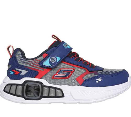 Supersej S Lights – Light Storm 3 sko med blink. Overdelen er af åndbart mesh-tekstil med slidstærke syntetdetaljer på bl.a. snuden, hælen og ved elastiksnøren. Skoen har ikkejusterbar elastiksnøre og lukkes med en velcrorem, og en trækfane på pløsen og hælen gør det nemt at træde i skoen, som har en polstret åbning for øget komfort. For enden af velcroremmen sidder en tænd/slukknap til det blinkende lys. Indersålen er polstret og komfortabel, og den støddæmpende mellemsål lyser op med blink på ydersiden af hælen. Den fleksible ydersål giver et fint fodfæste.