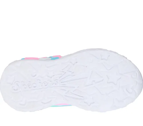 Superfin S Lights – Unicorn Charmer – Lil Heart Sparkles sko med blink, enhjørning og hjerter. Overdelen er af glittertekstil og syntet, dekoreret med hjerter. Skoen lukkes med en velcrorem over vristen, imens en ikkejusterbar elastiksnøre sørger for tilpasning til foden i løbet af dagen. En trækfane på hælen gør det nemt at træde i skoen, og åbningen er polstret for øget komfort og beskyttelse. Indersålen er komfortabel, og den stødabsorberende ydersål er dekoreret med et enhjørningehoved og har fire blinkende lys.