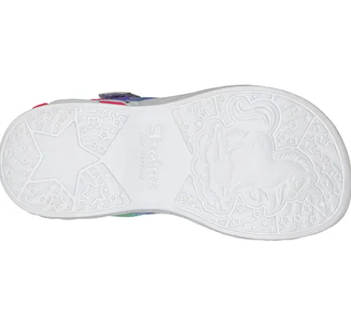 S Lights Unicorn Dreams Majestic Bliss er en festlig og farverig sandal med lys i enhjørningen på ydersiden af sålen ved hælen. Sandalen lukkes med to velcroremme henover forfoden og vristen; remmene har regnbuefarver med sølvstjerner, og remmen over vristen har en flot changerende stjerne for enden. En blød og behagelig sandal.