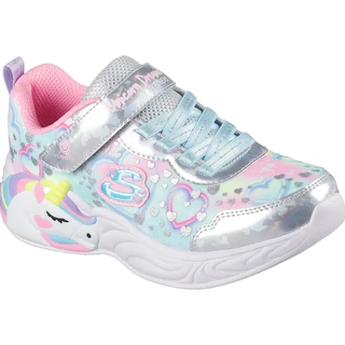 Superflot S Lights – Unicorn Dreams – Heart Sparkles sko med blink. Overdelen er af tekstil og syntet dekoreret med hjerter. Skoen lukkes med en velcrorem over vristen, som har en tænd-/slukknap for enden, imens en rund ikkejusterbar elastiksnøre sørger for, at skoen tilpasser sig foden i løbet af dagen. En trækfane på hælen gør det nemt at træde i skoen. Åbningen er polstret for øget komfort. Indersålen er komfortabel, og ydersålen er stødabsorberende med blink i den store, flotte enhjørning på ydersiden af sålens hæl.