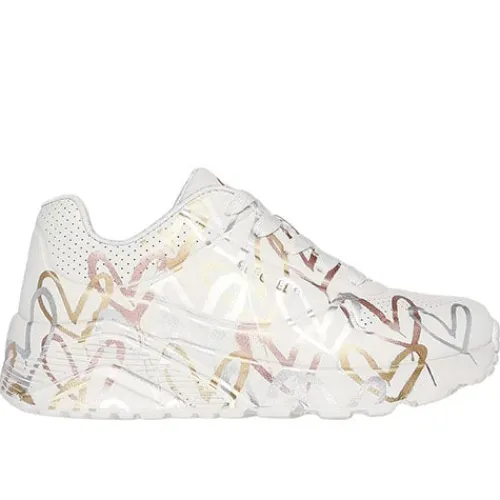 Supersmarte Uno Lite – Metallic Love sneakers med en overdel af perforeret syntetisk durabuck dekoreret med med sølv-, guld-og kobberfarvede hjerter. Denne sko er resultatet af det inspirerende samarbejde mellem Skechers og den anerkendte kunstner James Goldcrown, som bringer sine ikoniske Lovewall-hjertedesigns til Skechers. Skoen lukkes med snørebånd, og åbningen er polstret for øget komfort. Indersålen med Air-Cooled Memory Foam® er blød og stødabsorberende, hælkappen er fast, og den lette ydersål er fleksibel og stødabsorberende. Her får du en helt unik og komfortabel sko.