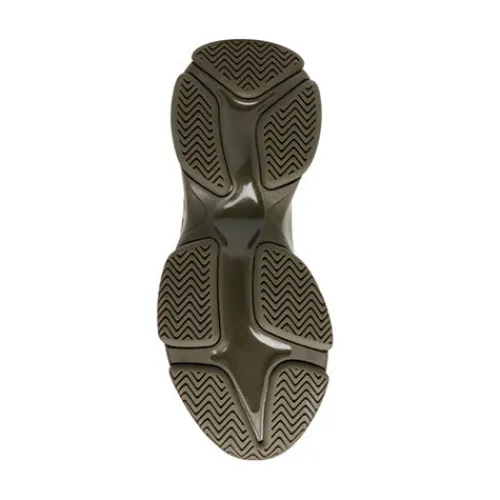Army farvet sneaker fra Steve Madden med sølvfarvet logoknap bagpå stroppen og tone-i-tone ydersål. Der er stræk i overdelens tekstilmateriale og skoen tages på som en sok. Modellen kan strammes ind med elastik foran.