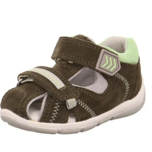 Denne fine Freddy sandal fra Superfit har lukket tå og hæl, og den lukkes med to velcroremme over henholdsvis forfoden og vristen. Overdelen er nubuck med tekstildetaljer, og den bløde indersål er læder.