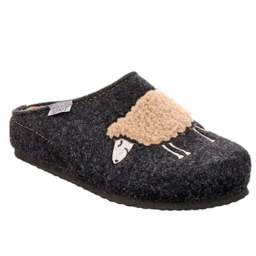 Dejlig slippers-hjemmesko lavet af italiensk uldfilt, dekoreret med et broderet og uldent får på forfoden. Ydersålen består af PU. Du får et diskret løft med en hælhøjde på 3,5 cm samt en plateauhøjde på 1,5 cm.