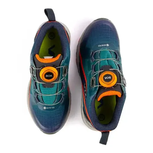 Supersmart og sej SKY Mid BOA GTX sko med GORE-TEX og BOA-lukning. BOA-snøren er wire, som giver skoen et ekstra sejt touch. Åbningen er polstret for øget komfort, og en trækfane på hælen gør det nemt at træde i skoen. Skoen er fyldt med smarte detaljer, bl.a. et sølvmønster på hælen og to orange striber på siden, som gentages nede i ydersålen. Med VADO Two-Width System har skoen to indersåler, som giver henholdsvis Medium og Wide Fit; fjern den nederste for mere rummelighed eller plads til ortopædiske indlæg. Indersålen er desuden markeret med vokseplads og kan maskinvaskes ved 30°. EVA-mellemsålen er støddæmpende, og gummiydersålen sikrer et godt fodfæste. VADO X Flex-zonen i det forreste område af sålen har vist sig at understøtte en sund gangudvikling.