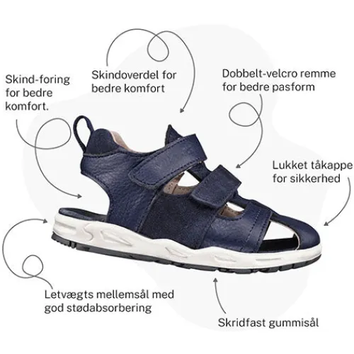 Fin sandal fra Viking med lukket tå. Lukkes med en enkelt velcro rem over vristen og kan justeres med en ekstra velcrorem over tæerne. Blød og behagellig åben hælkappe. Let og sporty ydersål.
