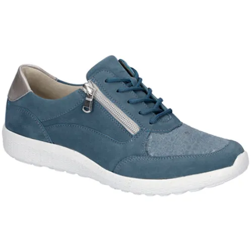 Praktisk og komfortabel Denver Giraffestr. Memphis sko fra Waldläufer. Overdelen er af nubuck, glat skind og elastisk tekstil, der giver god plads til bl.a. knyster, og med vidde K er der god plads til forfoden og tæerne. Skoen justeres med snørebånd og lukkes med en lynlås på ydersiden af vristen. Den udtagelige Orthotritt-indersål er polstret og blød og giver god komfort hele dagen. Ydersålen er meget fleksibel. Fås i halve størrelser.