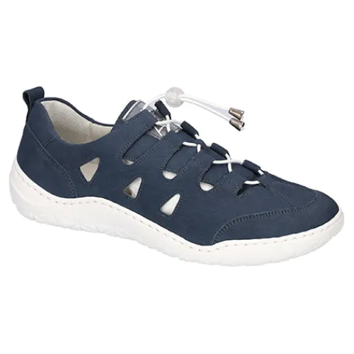 Lækker K-Milena Denver sko med en overdel af nubuck i et åbent og luftigt design foret med skind. Skoen lukkes med en elastiksnøre med speedlace, og en trækfane på hælen gør det nemt at træde i skoen. Åbningen er polstret for øget komfort, og med vidde K er der god plads til den bredere fod. Den udtagelige indersål er polstret og komfortabel, og den fleksible ydersål er stødabsorberende med et fint fodfæste. Fås i halve størrelser. Et par hvide, runde snørebånd medfølger i æsken.
