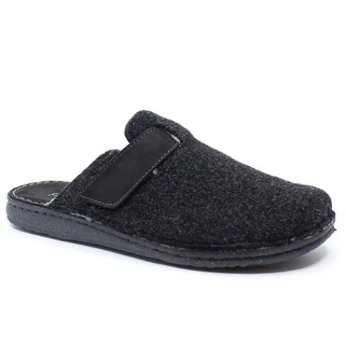 Komfortabel hjemmesko med tekstiloverdel fra Walk In The City. Hjemmeskoen har en justerbar rem over vristen, så den kan reguleres efter behov. Modellen har et varmt foer og er med ruskindsdæksål.