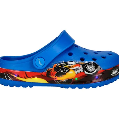 Sød Burundi Closed Kids sandal med blink i sålen. Overdelen er af PU med lufthuller for åndbarhed om forfoden. En drejelig hælstrop sørger for at holde foden på plads i sandalen, men kan også drejes op på vristen for en slippers-model. Dæksålen er stødabsorberende, og ydersålen, som er dekoreret med en racerbil og flammer, der lyser op ved gang, er stødabsorberende med et fint fodfæste.