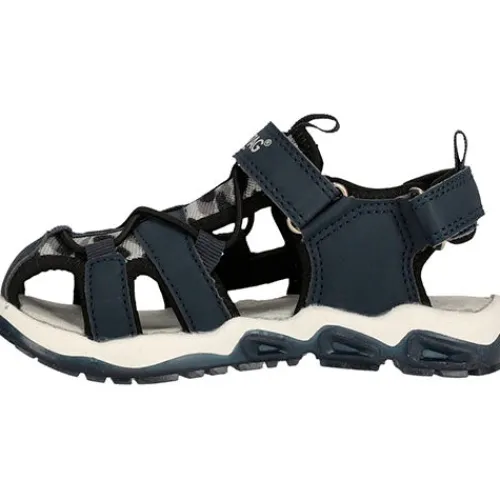 Flot Jugoe Kids Closed sandal med blink. Overdelen er af syntet og tekstil, og tåen er lukket for beskyttelse af de små tæer. Sandalen lukkes med to velcroremme (vrist og hæl), imens en ikkejusterbar elastiksnøre sørger for løbende tilpasning til foden, og en trækfane på hælen gør det nemmere at få sandalen på. Den bløde og komfortable dæksål beklædt med tekstil er støddæmpende, og den fleksible ydersål med blink på ydersiden er stødabsorberende med et godt vejgreb.