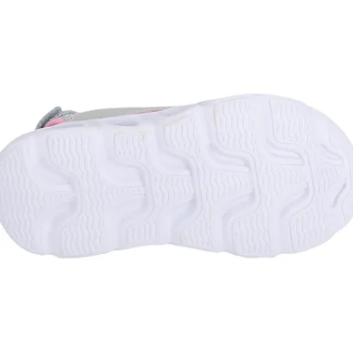 Kaptasia Kids sandalen med lys er en fin pigesandal, der reguleres og lukkes med tre velcroremme (forfod, vrist og hæl). Overdelen changerer smart i sølv og lyserød og har en del sølvglimmer, og ved hvert skridt blinker 5 lys langs ydersiden af mellemsålen.