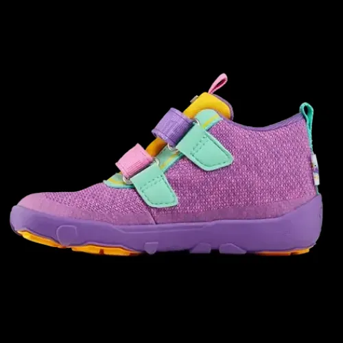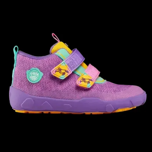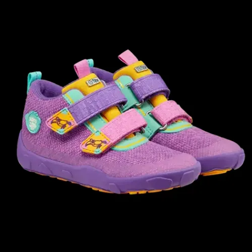 Dejlig Low Boot Knit Happy Creative Tucan sko med en overdel af strikket tekstil af bluesign®-certificeret polyester, foret med genanvendt polyester. Lukkes med to velcroremme over vristen, og trækfane på hæl og pløs gør det nemt at træde i skoen, som har en høj ankel. Åbningen og pløsen er polstrede for øget komfort og støtte, og skoen er udstyret med en åndbar og vandtæt AffenTex-membran, så fødderne holdes behageligt tørre. Indersålen er lavet af syntetisk skum og plantebaseret BLOOM™ skum, som er verdens første algebaserede EVA-skum til sko. Skoen er en Barefoot-model med en så tynd som muligt ydersål, så barnet kan mærke og opfatte underlaget. Ydersålen består af 70 % syntetisk gummi og 30 % naturligt gummi og er stødabsorberende med et godt vejgreb. Skoen er 100 % vegansk.