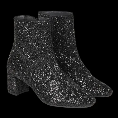 Funklende festlig ankelstøvle med en overdel af åndbart ruskind med sort glitter. Støvlen, der lukkes med en lynlås på indersiden af anklen, har en feminin og behaglig 6 cm blokhæl beklædt med glitter. Indersålen er polstret og komfortabel, og ydersålen har et rillet mønster, der forbedrer fodfæstet. Her har du en flot støvle, som kan bruges til både hverdag og fest.