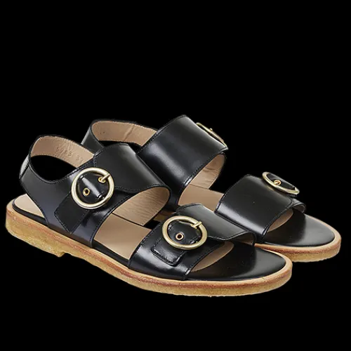Klassisk lædersandal med justerbare remme. Sandalen har en rund snude, justerbare remme med spændelukning med markante guldspænder, polstret læder indersål og en let, blød og fleksibel rågummisål i naturgummi. Udformet i naturligt og åndbart skind.