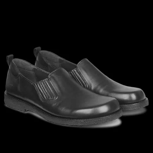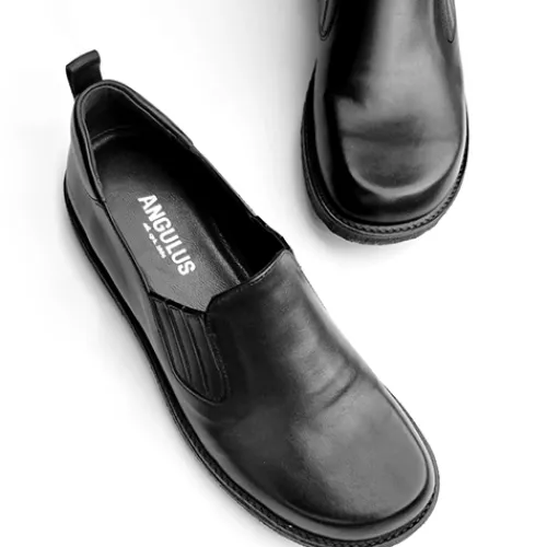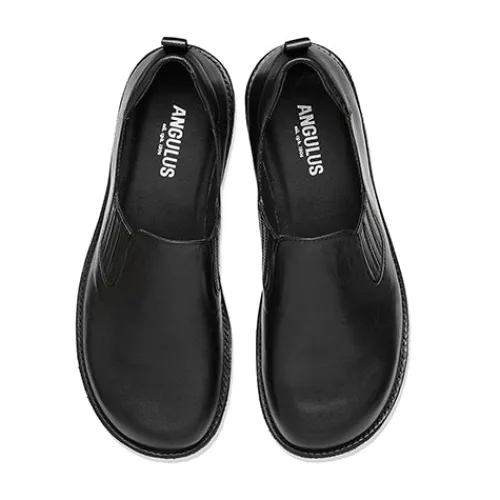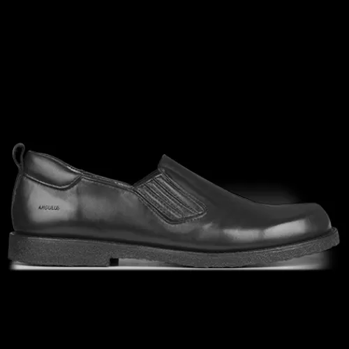 Helt igennem komfortabel sko fra Angulus. Overdelen er af glat skind med elastik i begge sider for løbende tilpasning til foden i løbet dagen. Skoen er en slip on-model med en trækfane på hælen, og åbningen er polstret på hælen. Modellen er bred og giver god plads til tæerne, og med skindfoer samt en dæksål beklædt med skind er der et godt fodklima. Den bløde, fleksible rågummiydersål er stødabsorberende med et godt fodfæste. Fås i halve størrelser.
