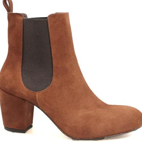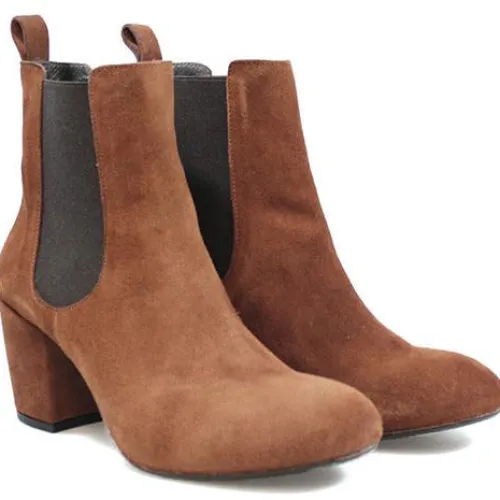 Angulus støvle med blokhæl og elastik i siderne. Indvendig er der skindfoer og dæksål i skind.