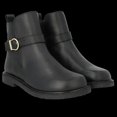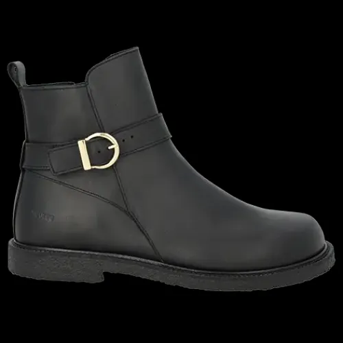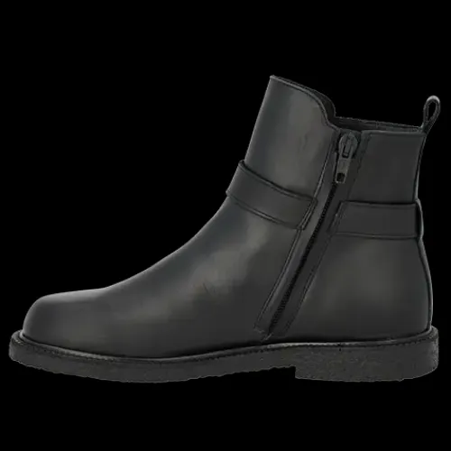 Lækker ankelstøvle med en overdel af glat skind med rund snude og en rem om anklen med et justerbart, guldfarvet spænde. Støvlen lukkes med en lynlås på indersiden af anklen og har en trækfane bagpå. Indvendig har støvlen et kromfrit skindfoer, så fodklimaet er optimalt. Støvlen er ekstra rummelig om forfoden. Indersålen er komfortabel, og den FSC-certificerede rågummisål med dekorativ rand er blød, fleksibel og stødabsorberende med et godt fodfæste. Fås i halve størrelser. Designet i Danmark og håndlavet med kærlighed i Portugal.