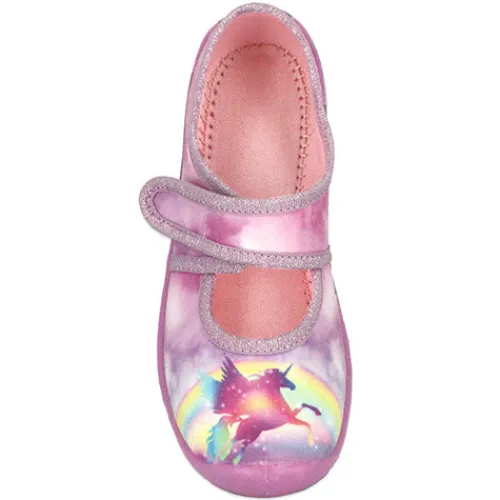 Dejlig Heaven hjemmesko af tekstil dekoreret med et print af en enhjørning og regnbue på forfoden og kantet med glittertekstil. Skoen lukkes med en velcrorem over vristen, og den fleksible gummiydersål er stødabsorberende og åndbar med et godt fodfæste.