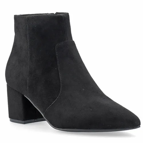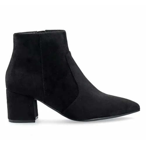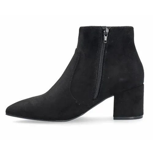 Fin Devived ankelstøvle med en overdel af tekstil i ruskindslook (mikrofiber). Støvlen lukkes med en lynlås på indersiden af anklen. En spids snude og en 6 cm høj blokhæl giver støvlen et ekstra feminint look.