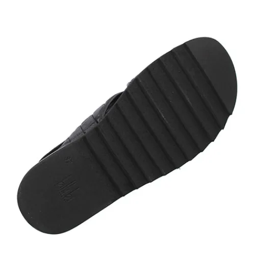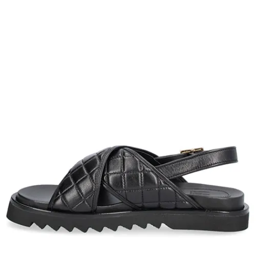 Håndlavet chunky sandal i sort quiltet skind på en mikrofiber sål. Sandalen har to brede remme der krydser henover foden samt en justerbar rem om hælen med guld spænde på siden.