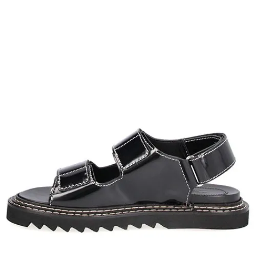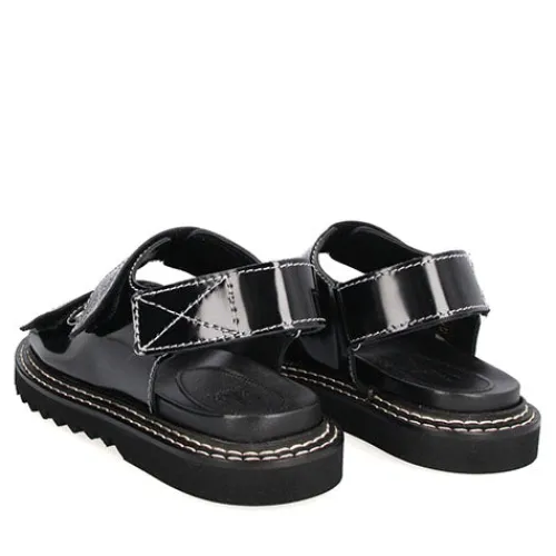 Håndlavet sort sandal fra Billi Bi. Udført i polido læder med en afrundet snude og mikrofibersål. Sandalen er dekoreret med to velcrostropper med hvide stikninger og en strop med velcrolukning bagpå.