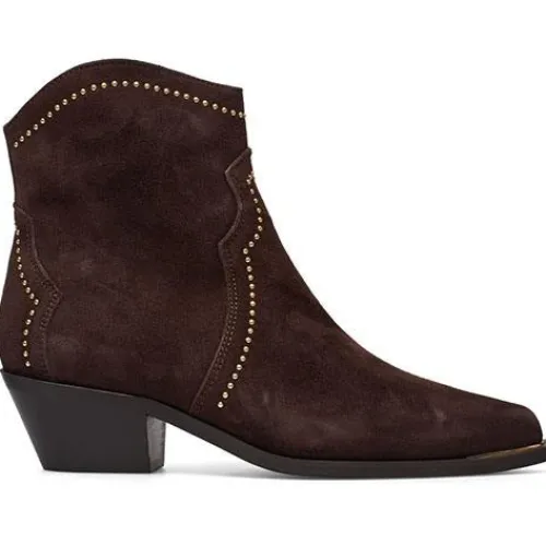 Brun ankelstøvle i ruskind med mellemhøj hæl og spids snude. Støvlen er dekoreret med en gulddetalje på snuden samt Western-inspireret stikninger dekoreret med runde guldnitter. Støvlen lukkes ved en diskret lynlåslukning på indersiden af støvlen.