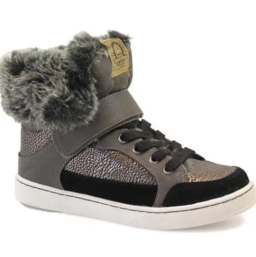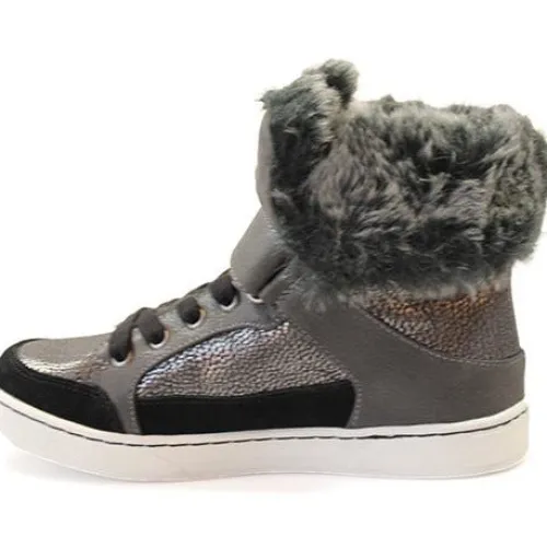 Super smart snørestøvle fra Bullboxer. Støvlen har en regulerbar velcrorem så støvlen sidder godt fast på foden. Fine detaljer med metaleffekt og varm pelskrave øverst på støvlen. Modellen har bløde og fleksible gummisåler.