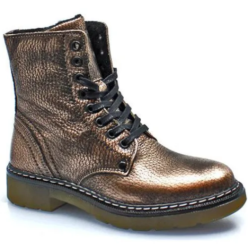 Snørestøvle fra Bullboxer i metallisk skind. Indvendig på skaftet et der lynlås. Støvlen er foret med lunt fleecefoer.
