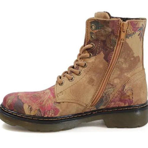Snørestøvle fra Bullboxer med blomster påtrykt hele støvlen. Brune snørebånd og brune syninger rundt i sålkanten. Indvendig på skaftet et der lynlås. Støvlen er foret med et lunt fleecefoer.