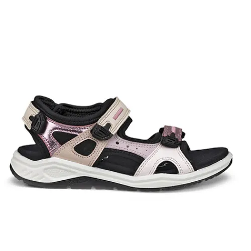 Lækker sandal med en overdel af tekstil samt glat skind, bearbejdet i ECCOs garverier, foret med åndbart tekstil, der hjælper med indvendig temperaturkontrol. Sandalen lukkes med tre velcroremme (forfod, vrist og hæl) for en optimal tilpasning til foden, imens en stabilitetsrem på ydersiden giver ekstra støtte langs fodens udvendige konturer. Den mikrofiberbeklædte dæksål giver komfort hele dagen. Den lette mellemsål giver god affjedring og komfort, mens den fleksible og slidstærke ydersål sikrer forbedret fodfæste og giver små fødder i voksealderen den nødvendige støtte og komfort. Herudover er den stødabsorberende ydersål unikt to-tonet med en gummi-del (sort) og en PU-del (hvid).