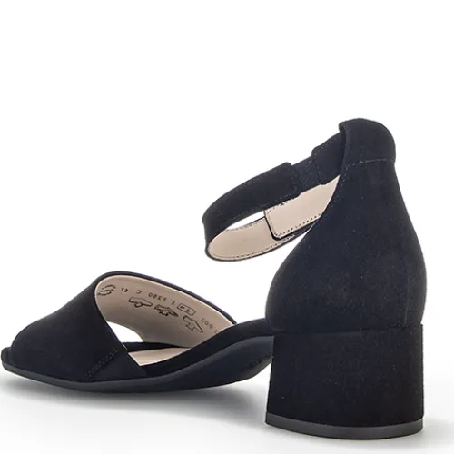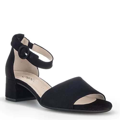Fin sandal med lukket hæl og en 4 cm høj blokhæl. Overdelen er af nubuck, og både foer og indersål er af skind og skaber dermed et bedre fodklima. Sandalen lukkes med en velcrorem om anklen, og remmen er dekoreret med et spænde. Fra Gabors Comfort-serie tilbyder sandalen ekstra bredde med vidde G og er dermed mere rummelig om tæerne og forfoden. Ydersålen giver et fint fodfæste. Fås i halve størrelser.