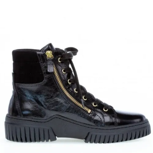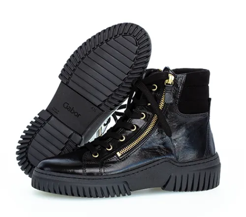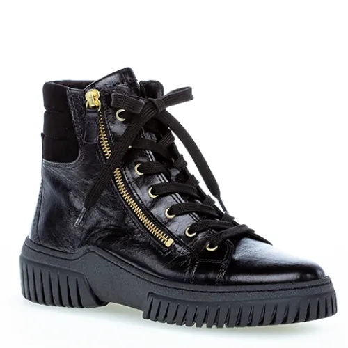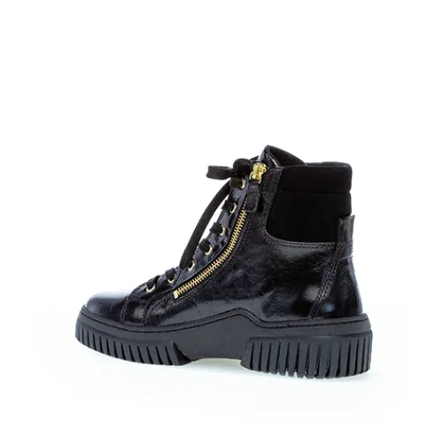 Smart Gabor støvle med gulddetaljer og to lynlåse. Overdel i blød skind med lak. Bløde og fleksible chunky såler.
