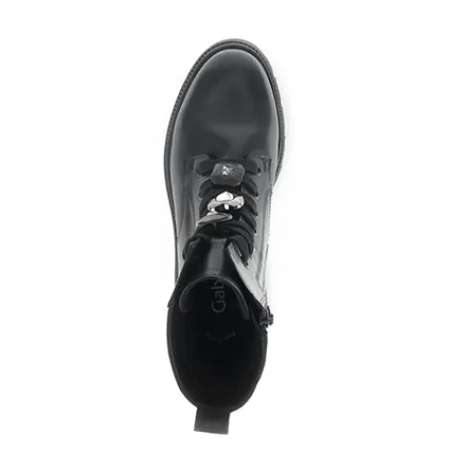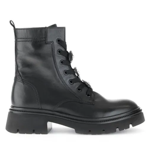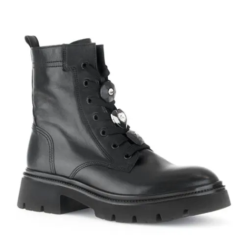 Dejlig støvle med en overdel af glat skind. Støvlen justeres med snørebånd og lukkes med en lynlås på indersiden af anklen, og en trækfane bagpå gør det nemt at træde i støvlen. Snørebåndet er pyntet med tre “facetslebne” knapper med hver sin store “diamant” (hhv. rund, firkantet og hjerte), som kan tages af snørebåndet. Indvendig har støvlen et let og lunt tekstilfoer, og indersålen kan tages ud. Den kraftige gummiydersål er stødabsorberende med et godt vejgreb. Fås i halve størrelser.
