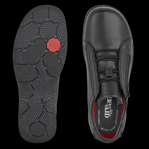 Dejlig og praktisk Walkie Wini sko med en overdel af glat skind. Skoen justeres med snørebånd og lukkes med en lynlås på ydersiden af snørebåndet. Indvendig har skoen et Soft Tex-foer, som transporterer fugt væk fra fødderne og holder dem dejlig tørre hele dagen, og den udtagelige 4,5 mm EnergySole™ Memory-indersål har indbygget svangstøtte og hælskål. Sålen er fremstillet af et særligt elastisk materiale, som stimulerer blodcirkulationen og forebygger træthed i fødderne. Med vidde H er der god plads om forfoden. Den fleksible gummiydersål er stødabsorberende med et godt vejgreb.