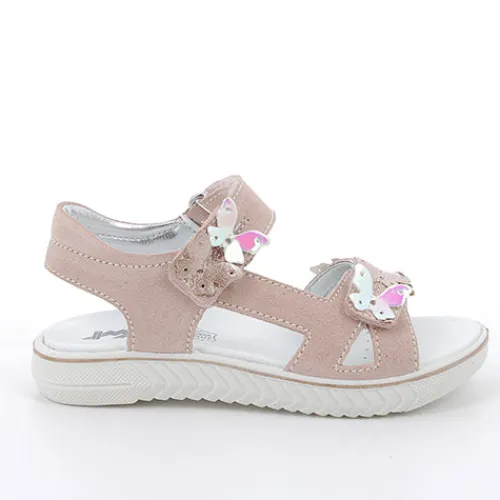 Supersød sandal med en overdel af ruskind dekoreret med sommerfugle på de to velcroremme, som sandalen reguleres og lukkes med (forfod og vrist). Den bløde dæksål af skind er komfortabel, støddæmpende og perforeret for øget åndbarhed, og den fleksible ydersål er stødabsorberende med en god bevægelighed og et fint fodfæste.