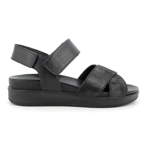 Sort sandal fra Imac med lille kilehæl og plateau under bunden. Krydsrem over tæerne og to velcroremme ved ankel.