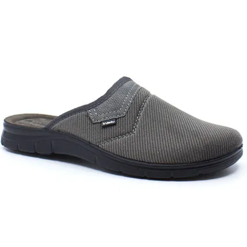 Grå tekstil hjemmesko fra Inblu. Dæksål i blød skind.