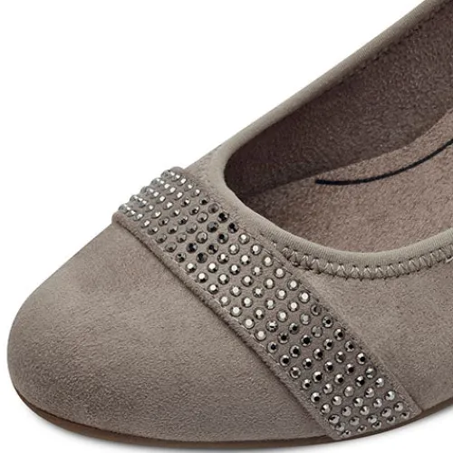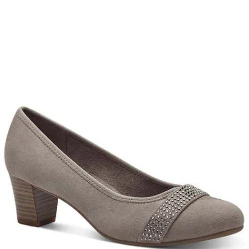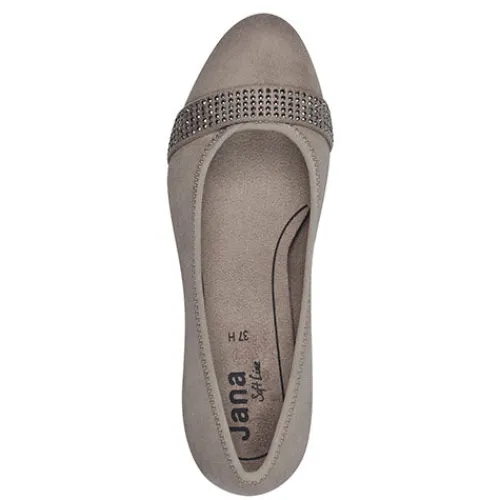 Fin pump fra Jana Soft Line-serien med ekstra komfort i dæksålen. Overdelen er af tekstil i ruskindslook foret med tekstil. Forfoden er dekoreret med en rem dekoreret med glitrende similisten. Med vidde H er der komfortabel plads til den bredere fod, og den polstrede Soft Line-indersål bidrager til komforten. Den flotte og robuste hæl i trælook er ca. 5 cm høj, hvilket understreger din femininitet uden at gå på kompromis med komforten. Den fleksible gummiydersål under forfoden giver et fint fodfæste. 100 % vegansk.