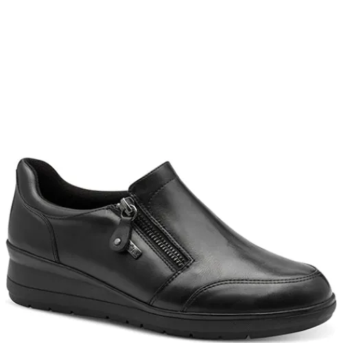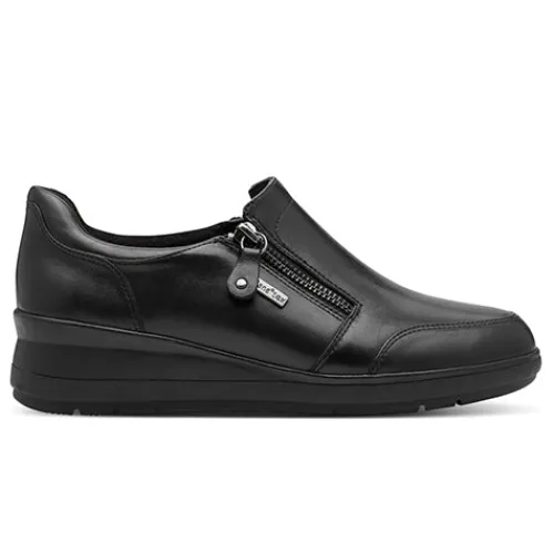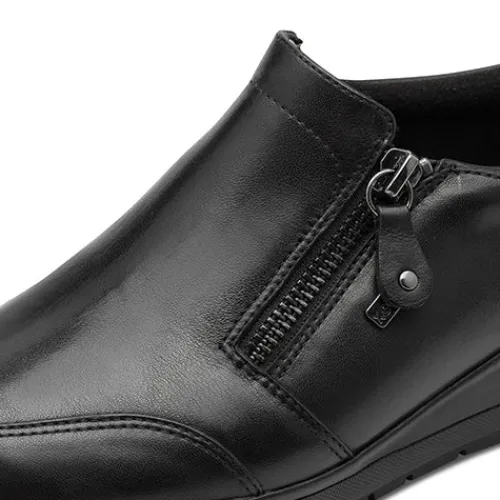 Vandtæt sko med kilehæl og ekstra vidde. Overdelen er af glat skind, og skoen lukkes med to lynlåse på hver side af vristen. Åbningen er polstret for øget komfort, og med vidde H er der plads til den bredere fod. En Jana tex-membran gør skoen vandtæt, Soft Line-indersålen er blød og komfortabel, og ydersålen med den feminine kilehæl er stødabsorberende med et godt fodfæste.