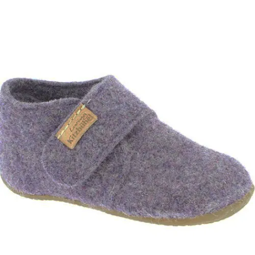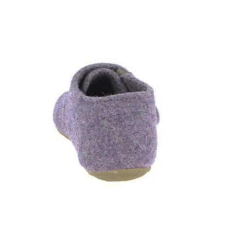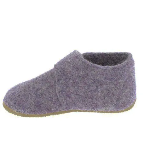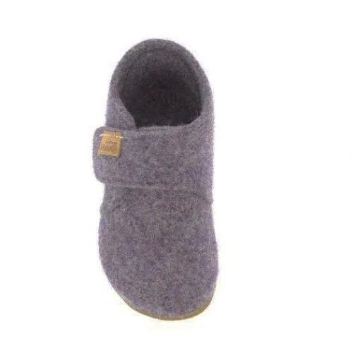 Fin hjemmesko af uldfilt, som lukkes med velcro over vristen. Gummiydersålen giver et godt fodfæste.