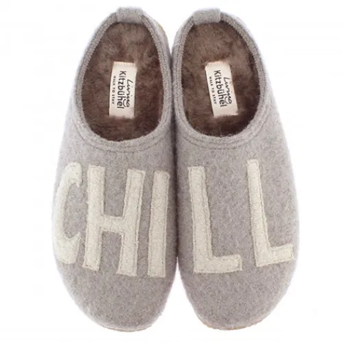 Fin hjemmesko fra Living Kitzbühel med lammeskind på indersålen. Dejlig varm og blød at have på. Teksten CHILL over foden.