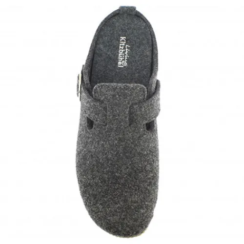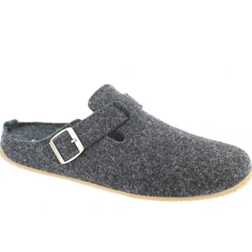 Klassisk unisex hjemmesko lavet af kraftig filt af specialbehandlet genbrugsuld og polyester med en rem med metalspænde over vristen. Den fleksible gummiydersål er slidstærk med et godt fodfæste. 100 % designet og fremstillet i EU.