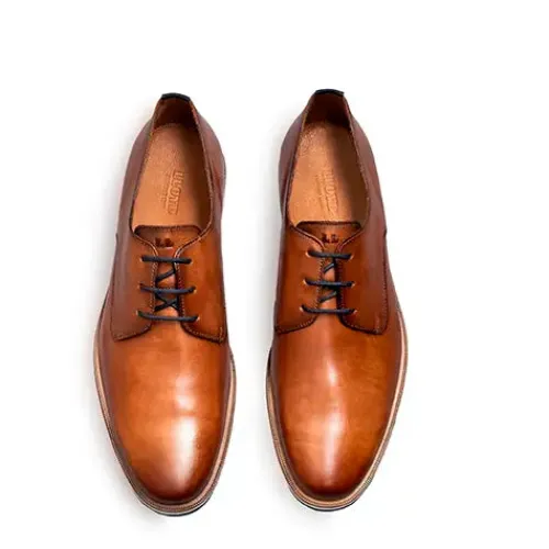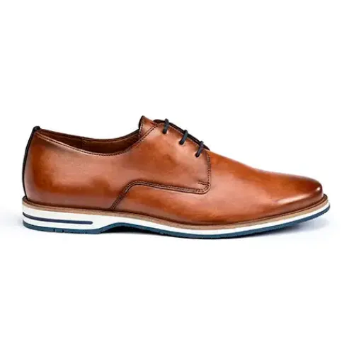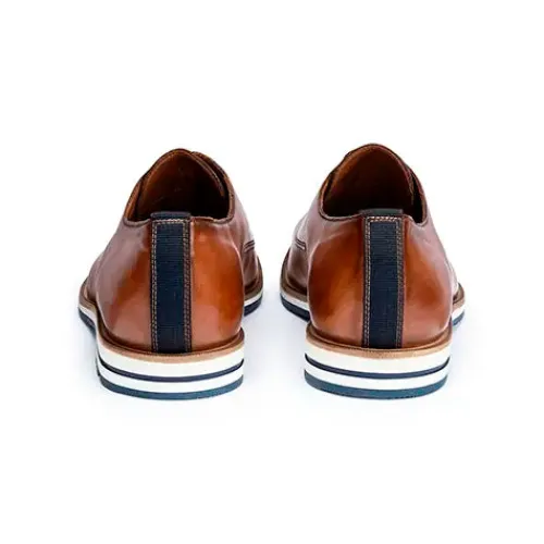 Klassisk og elegant Dakin sko med en overdel af glat læder med en stribe mørkeblåt tekstil på hælen. Skoen lukkes med snørebånd, og skindindersålen er polstret under hælen. Den fleksible gummiydersål med den karakteristiske røde Lloyd-stribe under hælen er stødabsorberende med et fint fodfæste. Fås i halve størrelser.