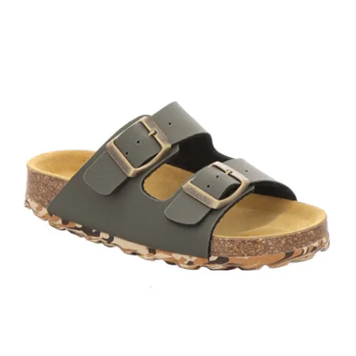 Skøn slippers-sandal med en overdel af syntet. Sandalen reguleres med to remme med bronzefarvede spænder over forfod og vrist. Den polstrede dæksål er beklædt med ruskind og har tågreb samt en fodskål, der holder foden på plads. Sandalen har en fleksibel ydersål i varme camouflagefarver og giver et fint fodfæste.