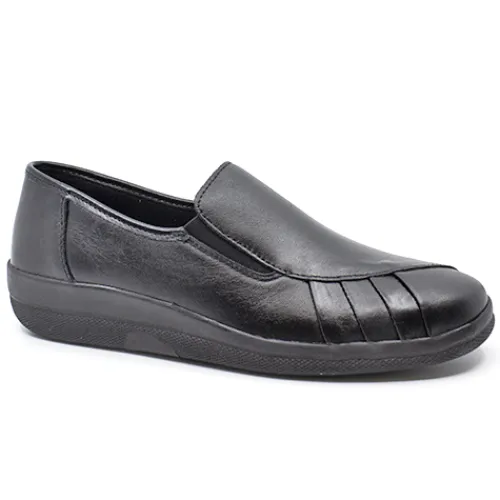 Komfortabel og let hyttesko med en overdel af glat skind med spændende syninger. Åbningen har elastik i siderne. Den udtagelige indersål beklædt med skind er komfortabel, og den fleksible ydersål er stødabsorberende.