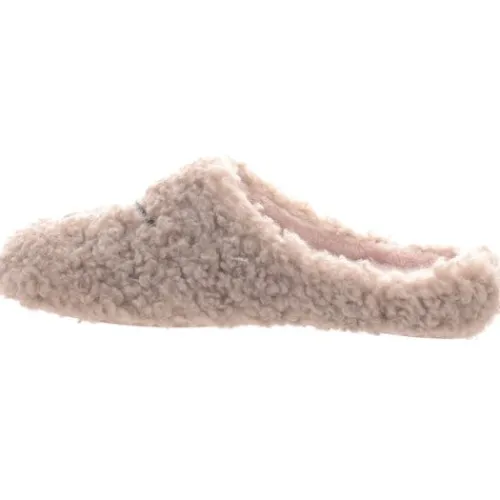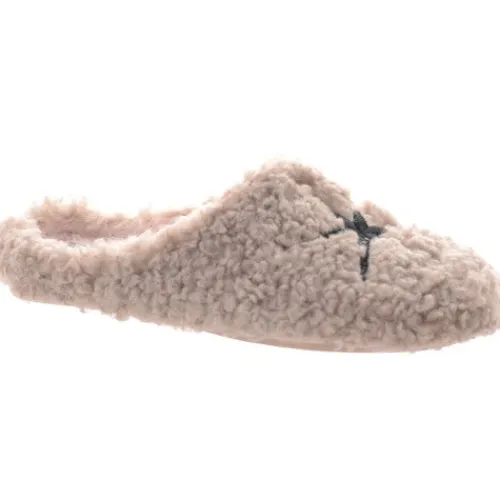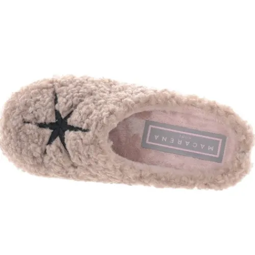 Lun og hyggelig slippers-hjemmesko med en overdel af tekstil i lammeuldslook, dekoreret med en sort, sekstakket kompasstjerne på forfoden. Hele skoen er foeret med et blødt og lunt tekstilfoer. Den udtagelige indersål er polstret, komfortabel og belagt med blødt foer, og den meget fleksible gummiydersål giver et fint fodfæste og beskytter mod kulde nedefra. Der medfølger en sød skopose.