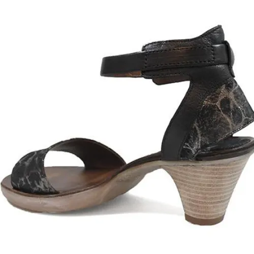 Fin sandal fra Mjus med metalisk effekt i skindet. Sandalen lukkes med spændelukning omkring anklen.