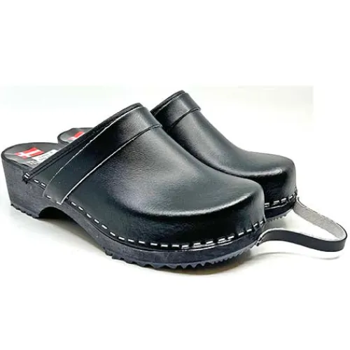 Klassisk tøffeltræsko med træbund. Overdelen er af glat skind, og træbunden har gummibeslag.